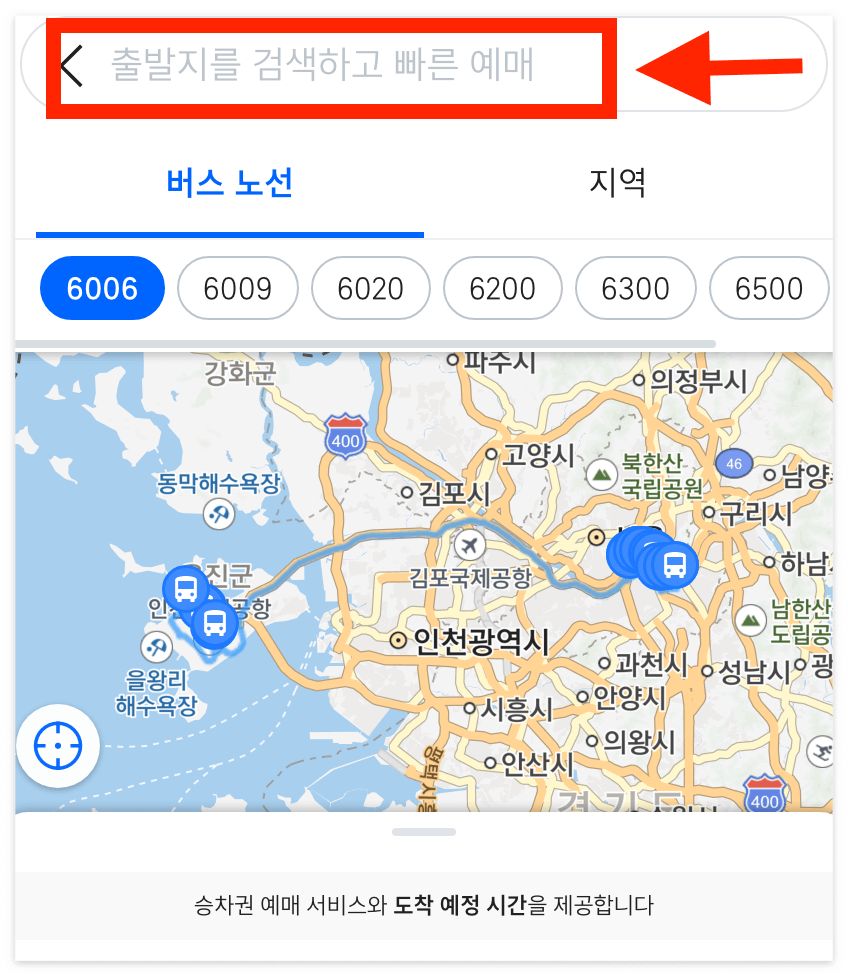 - 출발지는 상단에 검색과 버스 노선, 지역설정을 통해 선택하실 수 있습니다.