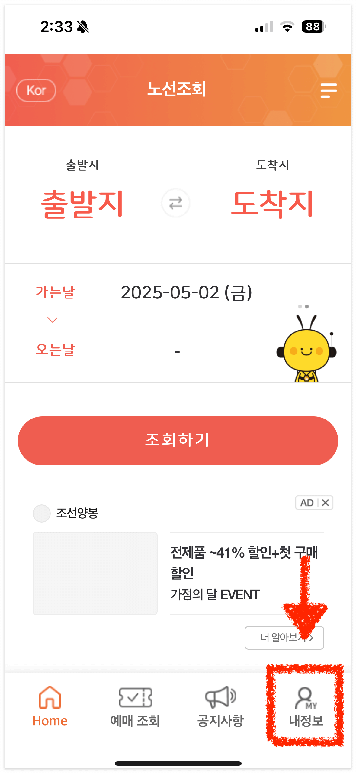 - 출발 날짜를 선택하고 [조회하기] 버튼을 눌러주세요.
