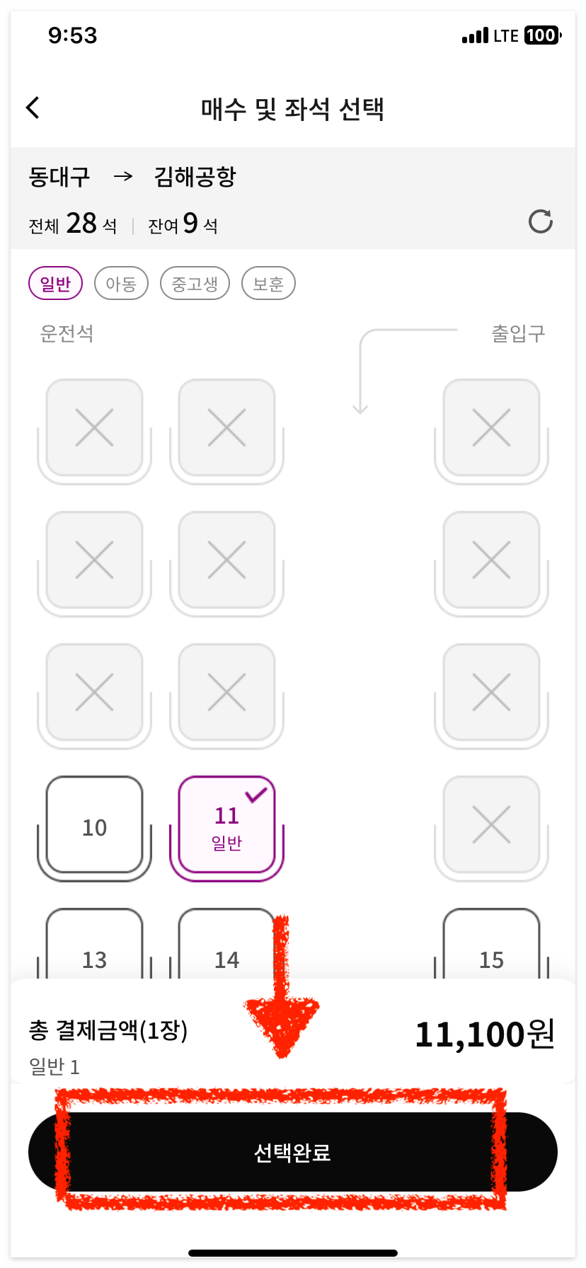 - 원하는 좌석을 고른 뒤 [선택 완료] 버튼을 누르세요.