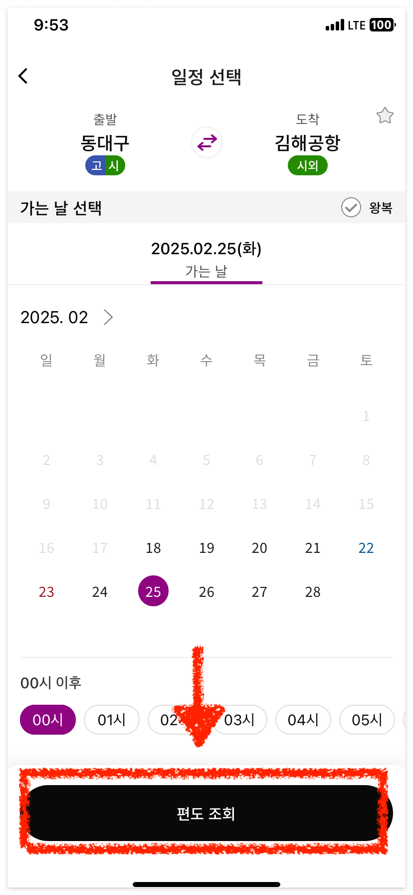 - 여행 날짜를 선택하고 [편도 조회] 버튼을 누릅니다.