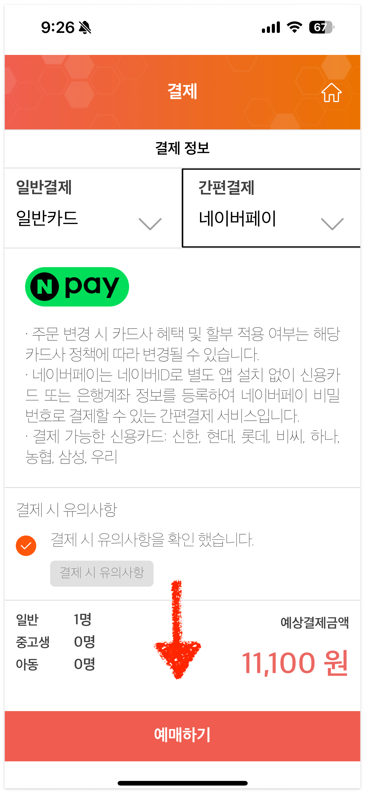 - 일반결제/간편 결제를 선택하고 [예매하기]를 누르면 완료!