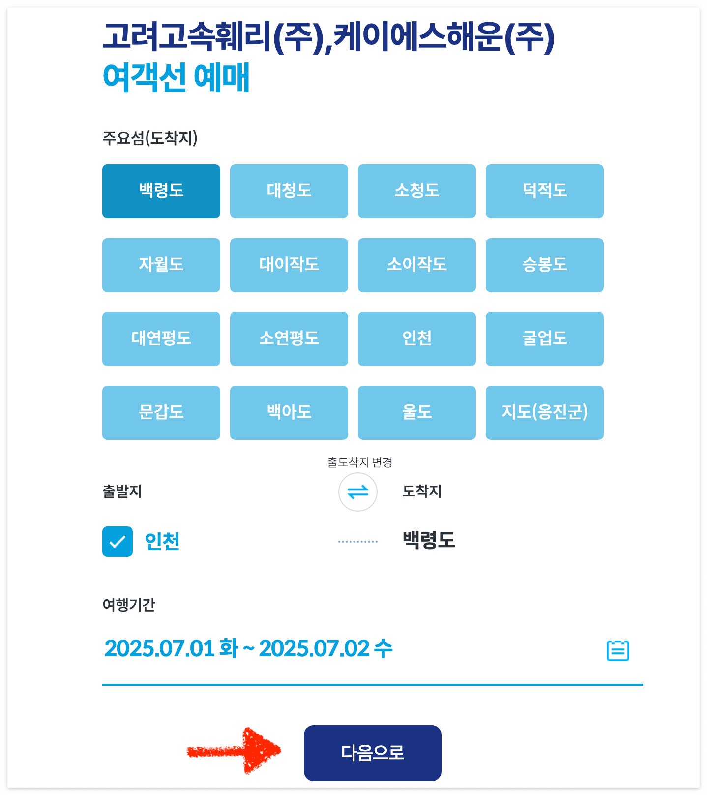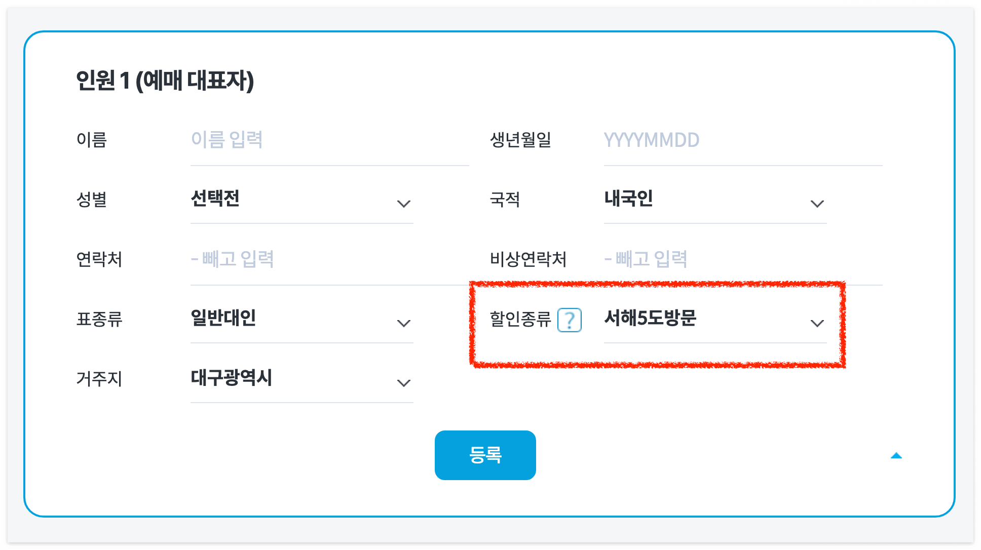 - 할인을 받으려면 반드시 할인 종류를 '섬나들이/서해 5도'로 선택해 주세요.