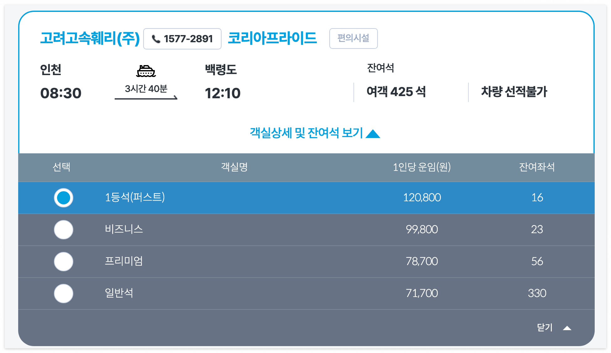 앞서 말씀드린 것처럼, 고려고속훼리 공식홈페이지를 통해 미리 배편을 예매하실 수 있어요. 아래는 예약 가능한 섬 목록입니다.