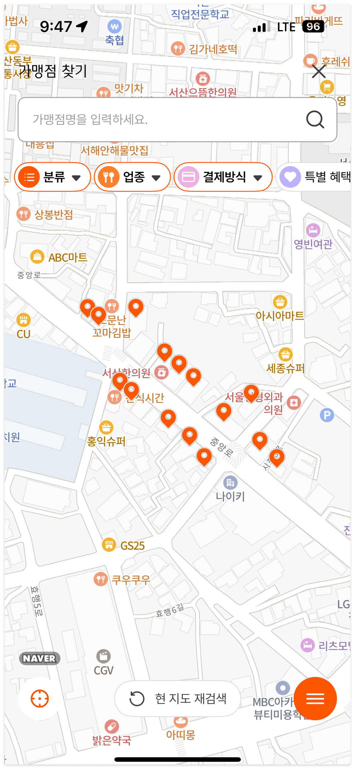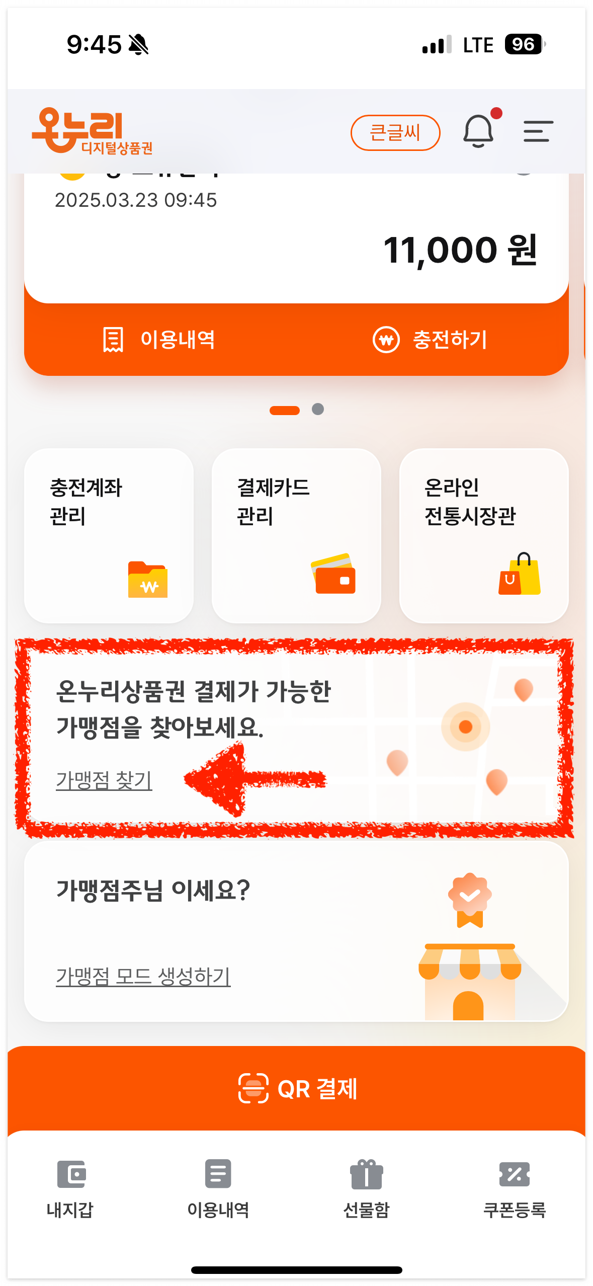 - 홈화면에서 [가맹점 찾기]를 누릅니다.