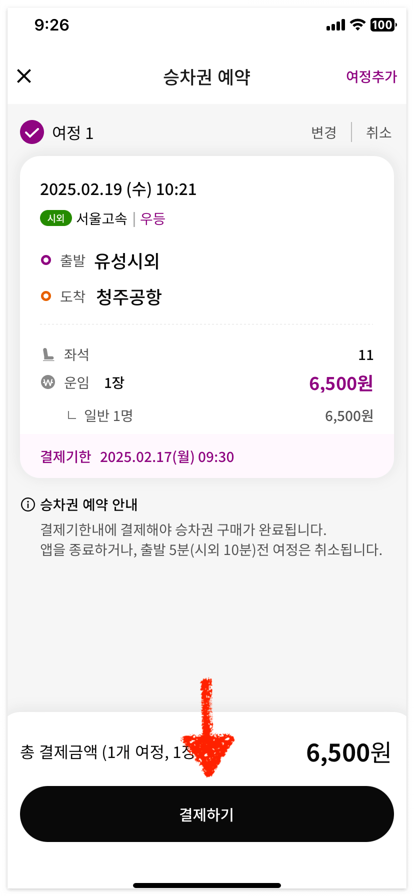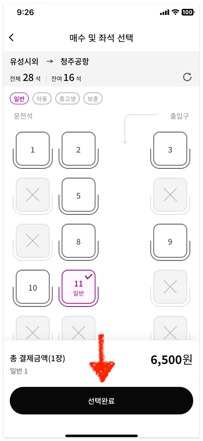 마지막으로 좌석을 고르고 결제를 마치면 청주공항 리무진 예매가 완료됩니다.