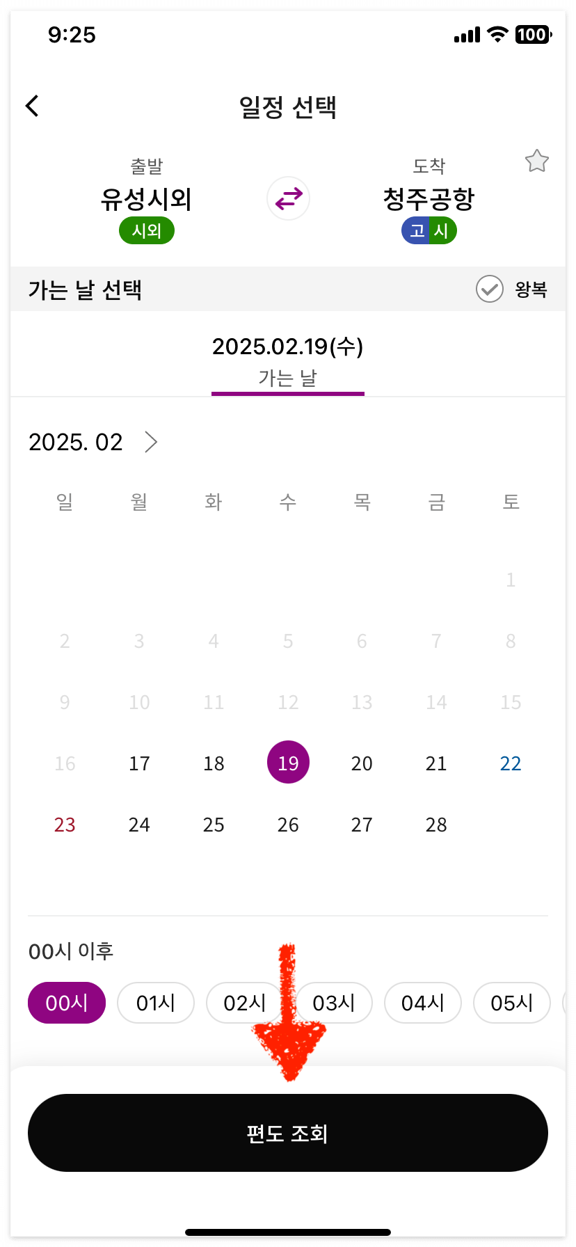 - 출발 날짜를 선택하고 [편도조회] 버튼을 누릅니다.