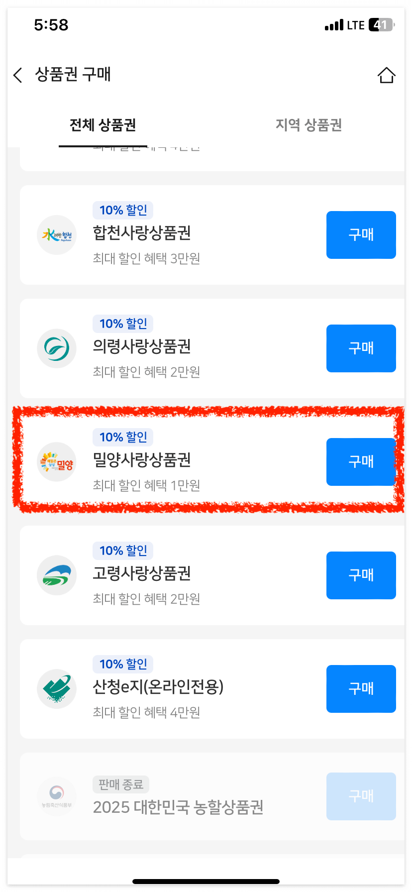 - 지역상품권 중에서 [밀양사랑상품권] 구매를 누릅니다.