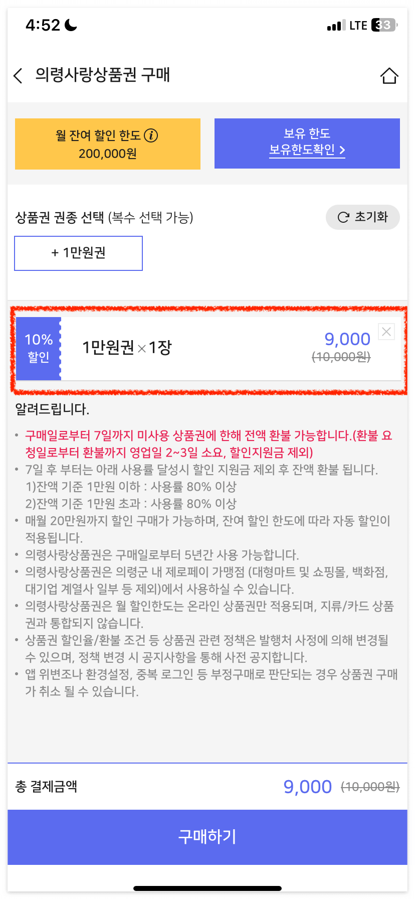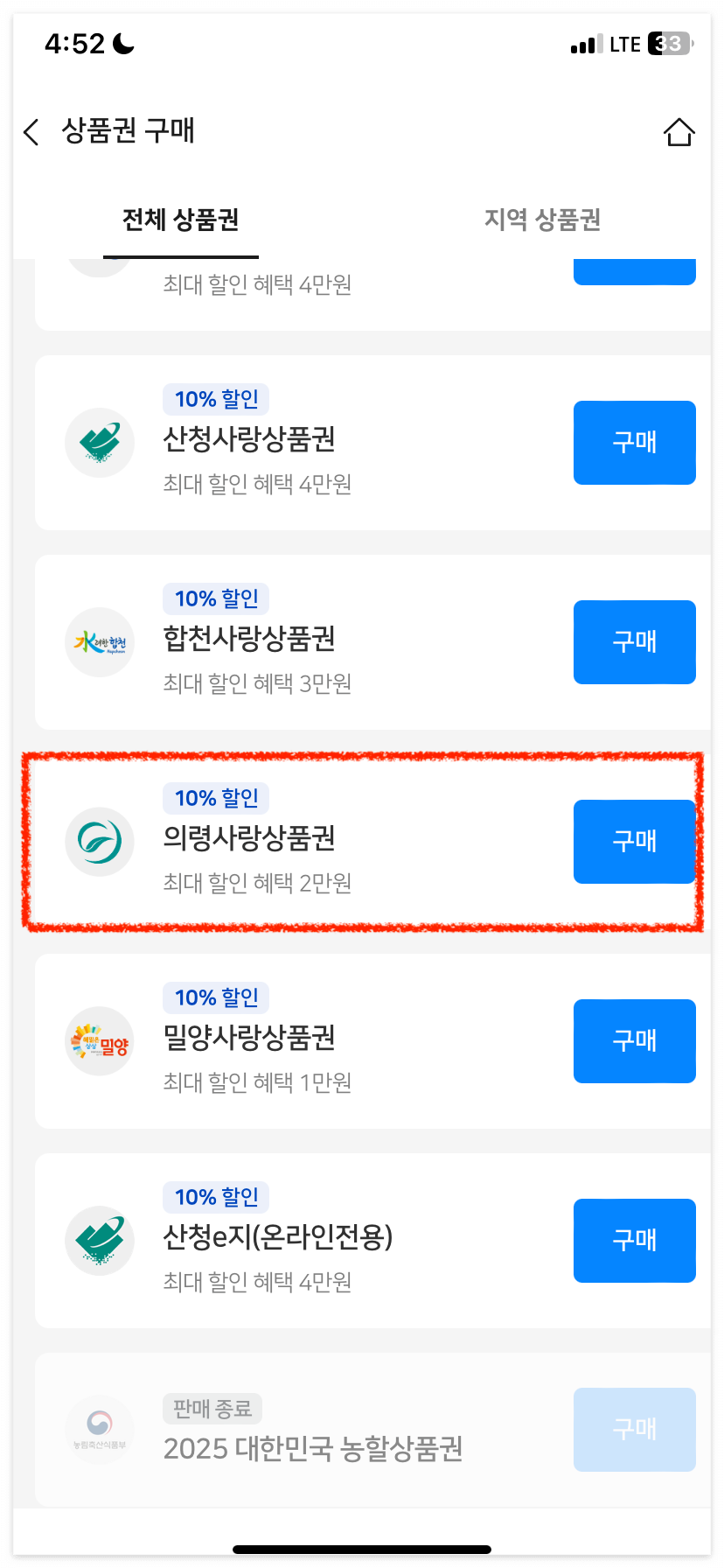 - 지역상품권 중에서 [의령사랑상품권] 구매를 누릅니다.