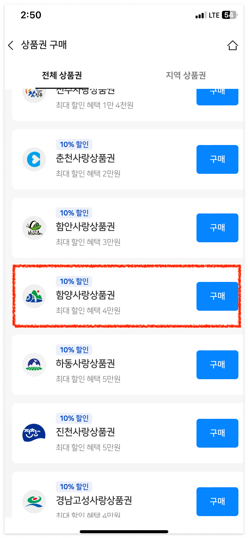 - 지역상품권 중에서 [함양사랑상품권] 구매를 누릅니다.