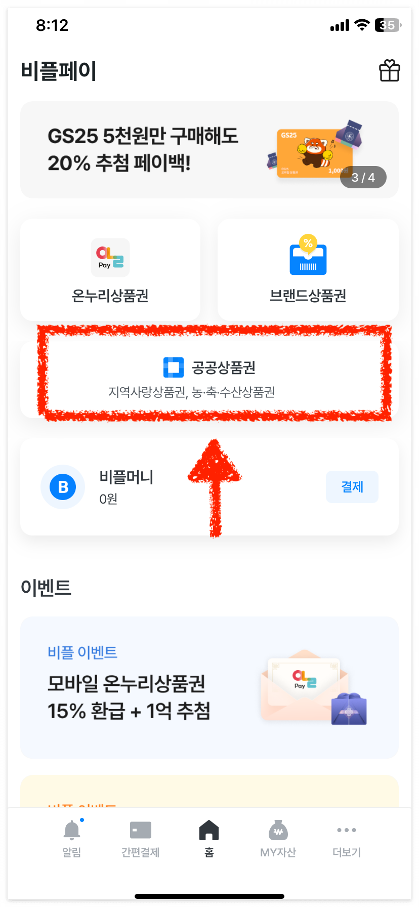 - 비플페이 홈 화면에서 [공공상품권]을 클릭해 주세요.
