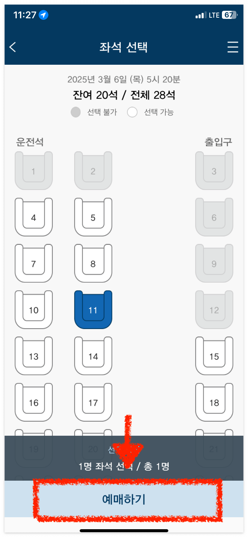 - 출발일과 인원수를 설정하고 [예매하기]를 클릭합니다.