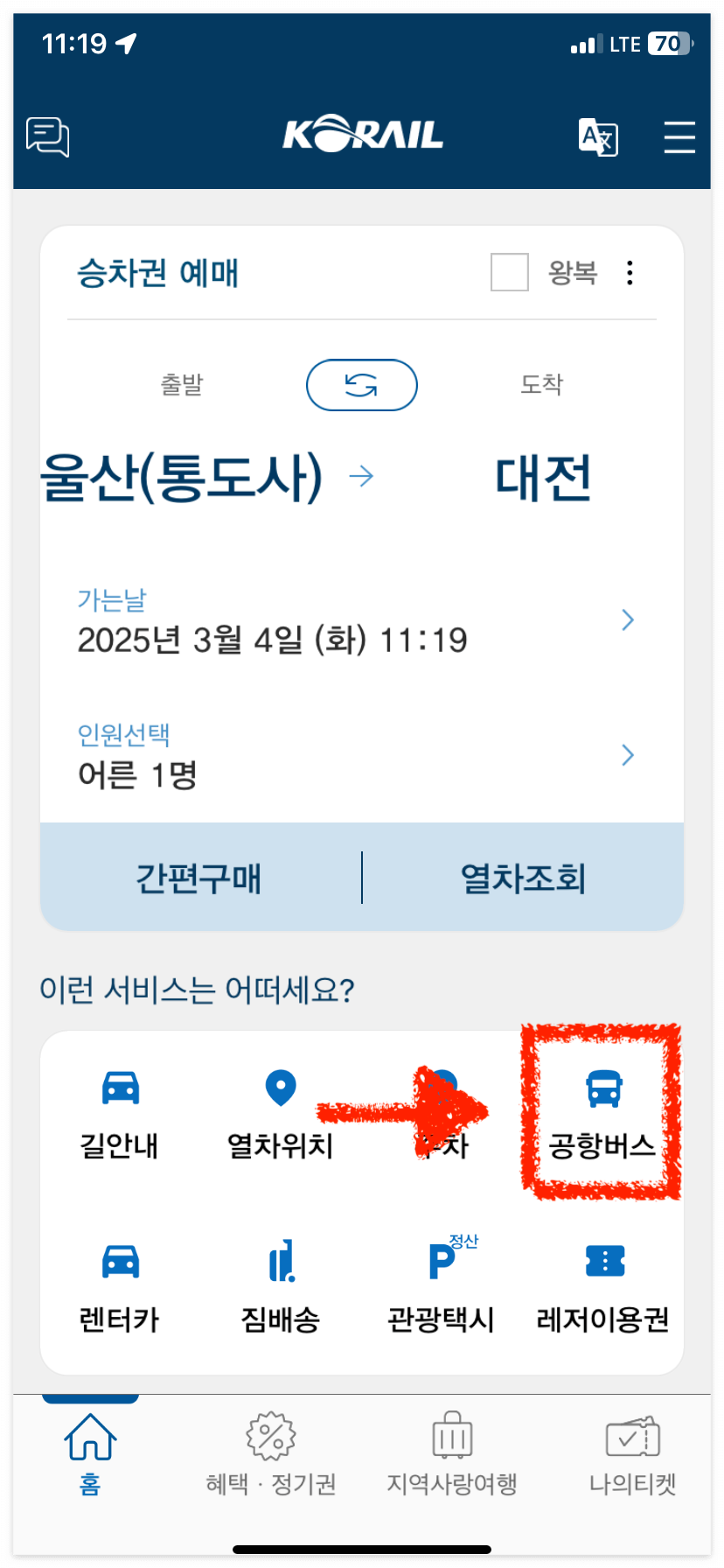 - 코레일 어플 홈화면에서 [공항버스]를 클릭해 주세요.